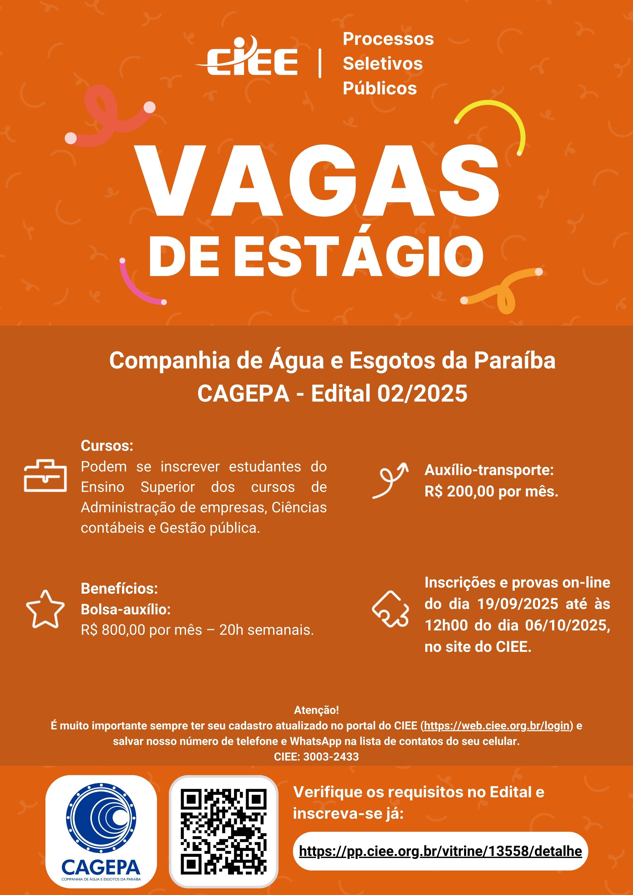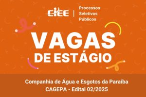 A Companhia de Água e Esgotos da Paraíba (CAGEPA) e o Centro de Integração Empresa Escola (CIEE) prorrogaram o prazo de inscrição para o processo seletivo de estágio da empresa. Conforme retificação do edital publicada nesta quinta-feira (2), os interessados podem se inscrever e realizar as provas online até as 12h do dia 13 de outubro. As inscrições, assim como as provas, devem ser feitas exclusivamente pelo site do CIEE.